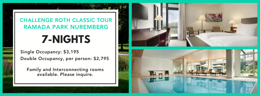 This is the tour that started it all! The original, the classic, Challenge Roth 7-Night tour that bases at the Ramada Park Hotel in Nuremberg is absolutely loaded with services and amenities for 2026, all at a budget-friendly price point. You’ll have everything you need for a great race week, including 7-nights of superior 4-star hotel accommodations, round trip airport shuttles, daily breakfast, all transfers to and from Roth, and help from our highly experienced Challenge Roth pro guides. Located in a quiet, leafy suburb 5 minutes from downtown Nuremberg, with sightseeing, dining, and shopping at your doorstep, the Challenge Roth Classic 7-Night Tour is also conveniently situated for training near two swimming pools and an expansive green park. You’ll love the advantages of this 7-night tour; easier acclimation for your mind and body, and easier on the travel budget than ever before!