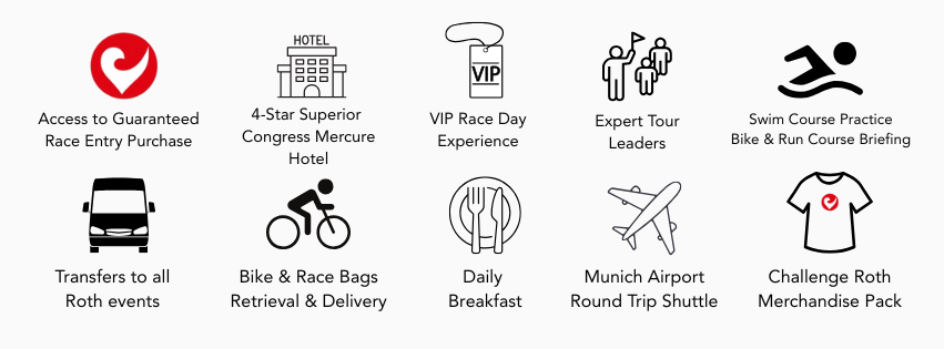 ALL GROUND TRANSPORTATION: Leave the driving to us! We include round trip airport shuttles to the hotel from Munich airport, and all transportation to key race week activities in Roth. Transfer time to Roth is approximately 25 minutes. No need for a rental car, but should you wish to have one, there is free parking at the Congress Mercure hotel.