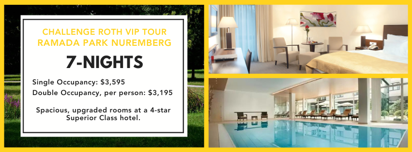 The Ramada Park hotel has just been added to our VIP program. It is a Superior 4-star property located about 5-7 minutes from downtown Nurmeberg. When you book the 7-night VIP program at Ramada Park, you’ll enjoy upgraded rooms, daily breakfast (including a full spread on race morning), VIP merchandise pack, and access to the behind-the-scenes tour of Challenge Roth with Felix Walchshofer. This hotel serves as “headquarters” for the Challenge Roth Tour, and offers a scenic, quiet place to train and relax that’s close to everything.